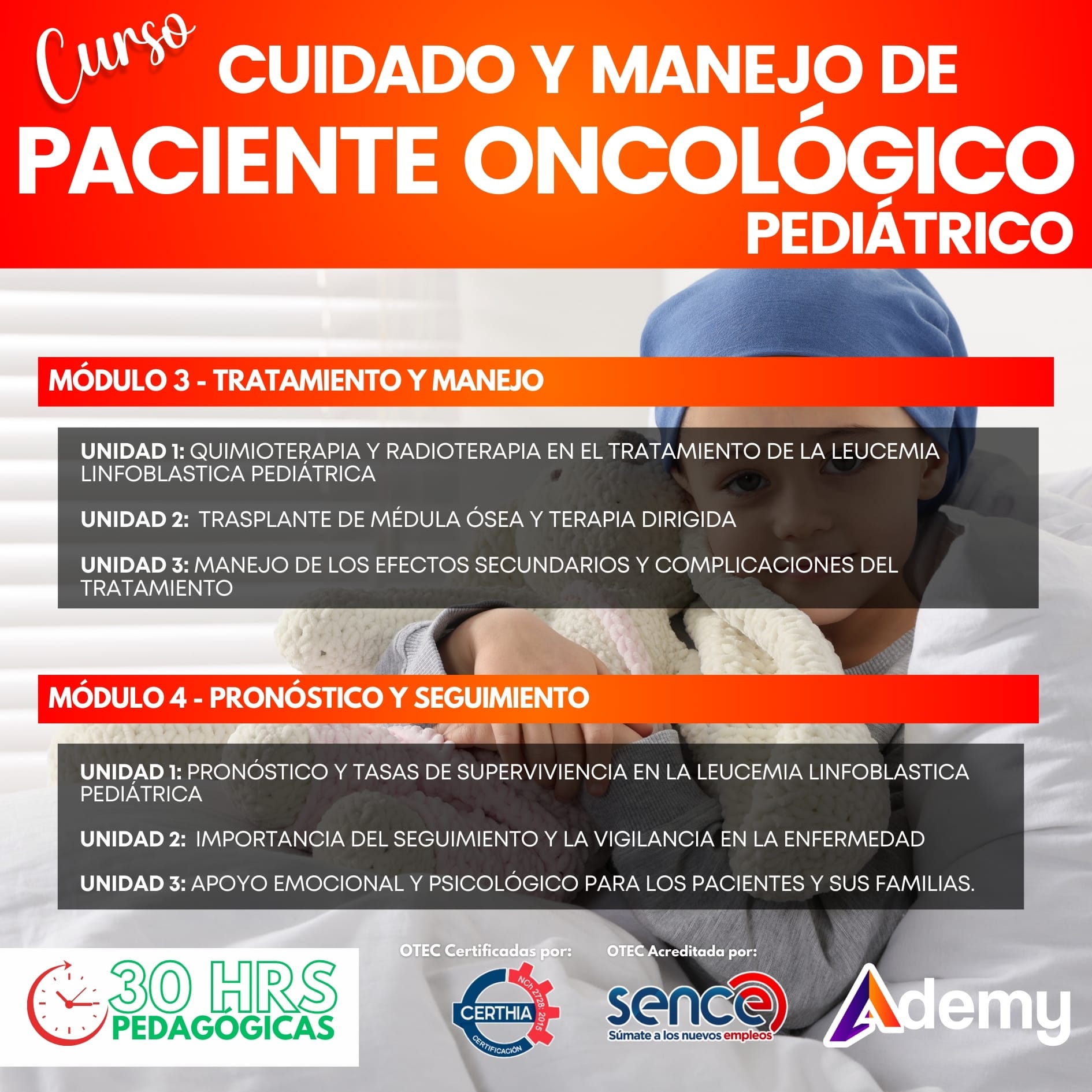 El Curso de Cuidado del Paciente Oncológico Pediátrico está diseñado para proporcionar conocimientos fundamentales sobre la leucemia linfoblástica pediátrica, la forma más común de cáncer infantil. Durante este programa asincrónico de 30 horas pedagógicas, los participantes aprenderán sobre la epidemiología, el diagnóstico, el tratamiento y el manejo integral de la enfermedad. Además, se abordará la importancia del apoyo emocional y psicológico para los pacientes y sus familias.