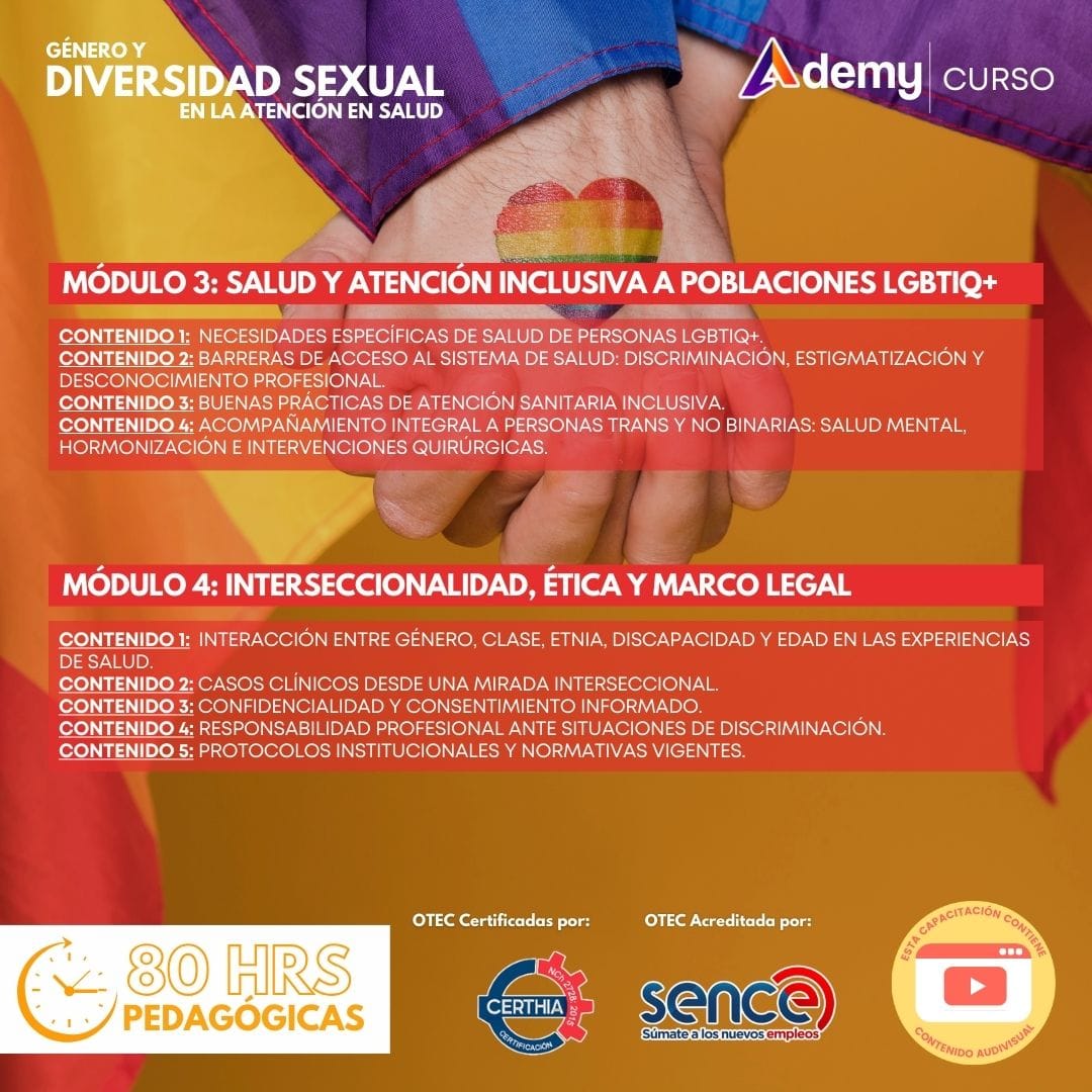 El curso Género y diversidad sexual en salud tiene una duración de 80 horas pedagógicas y se desarrolla en modalidad 100% online asincrónica. Incluye contenido audiovisual, material complementario y análisis de casos prácticos. Está orientado a fortalecer competencias para una atención sanitaria inclusiva, equitativa y basada en derechos humanos.