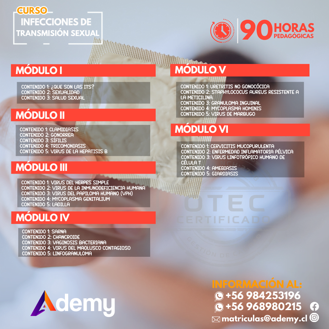 Explora nuestro curso de Infecciones de Transmisión Sexual (ITS) en Ademy, una experiencia educativa asincrónica de 90 horas en 60 días. Desde la definición de ITS hasta tratamientos específicos, el acceso exclusivo a la plataforma 24/7 te permite aprender a tu ritmo. Obtén un certificado al finalizar, marcando tu competencia en el tema de ITS.